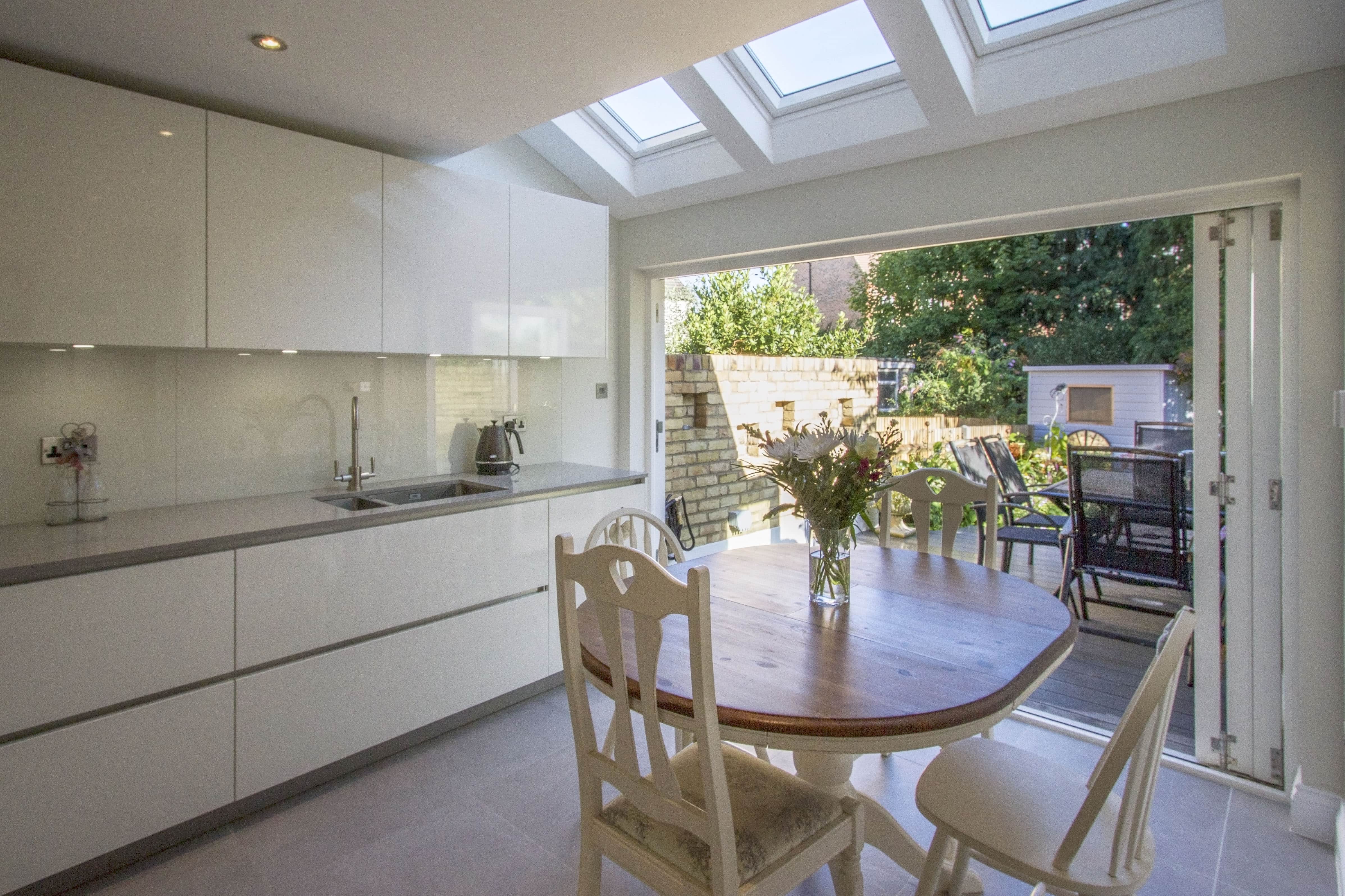 Some layouts can be challenging and you may need a solid length of wall which could result in blocking entry points of natural light. Make sure you compensate for this natural light loss by adding large glass sliding doors or skylights as shown in this Teddington project.