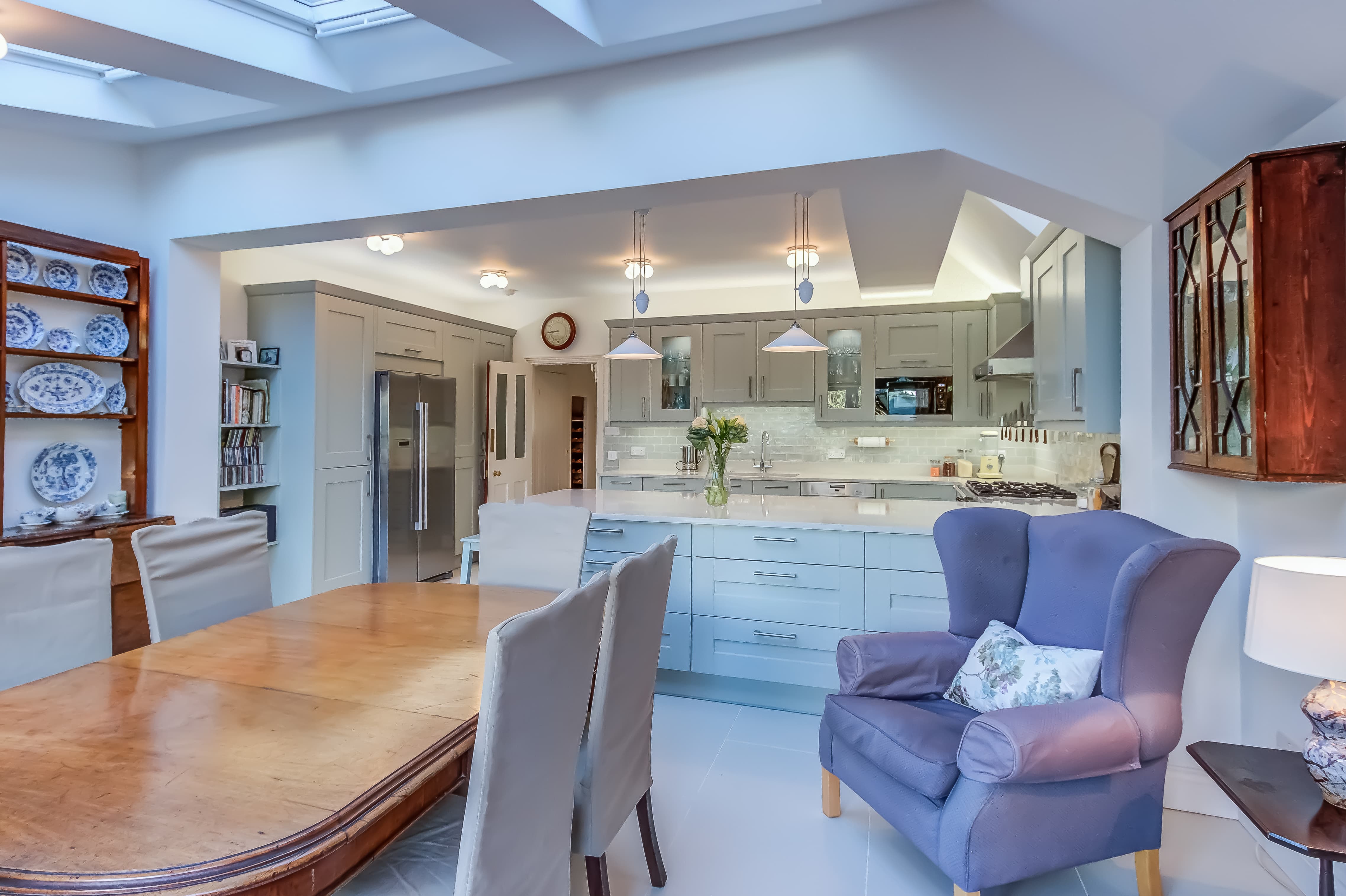 The good old saying “less is more” really comes to shine in an open-plan kitchen dining space. Rather than making it ‘cupboard central’, opt for an eye-catching kitchen island that accommodates storage space. It worked beautifully within this open-plan kitchen diner in Hampton Hill which feels spacious and open.