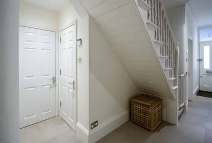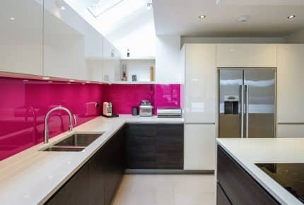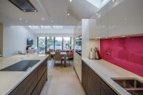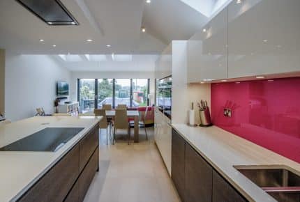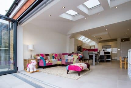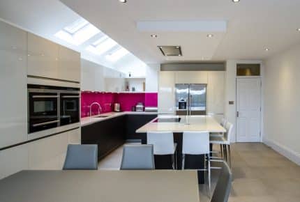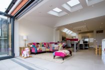 This project for a house in Teddington involved a rear extension and internal refurbishment of the existing ground floor. The new extension was built out far enough to accommodate Velux windows to the side return and rear, which, together with large bifold doors, flooded the open plan space with plenty of natural light, particularly in dark areas of the home. Internally, within the extension we created a large family kitchen/living/dining area, complete with underfloor heating. The existing internal layout was reconfigured to provide a cloakroom, utility and separate living room.